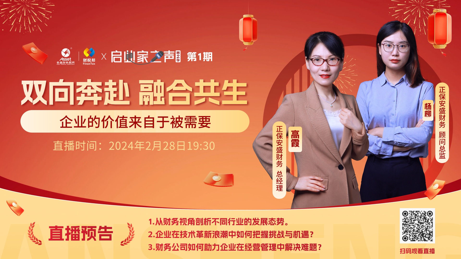 2024年2月28日19:30,正保安盛財(cái)務(wù)視頻號(hào)推出《啟業(yè)家之聲》第二季第1期《【雙向奔赴 融合共生】企業(yè)的價(jià)值來(lái)自于被需要》龍年首場(chǎng)主題直播,邀請(qǐng)正保安盛財(cái)務(wù)總經(jīng)理高霞和咨詢顧問(wèn)中心總監(jiān)楊柳與大家線上交流互動(dòng)。
