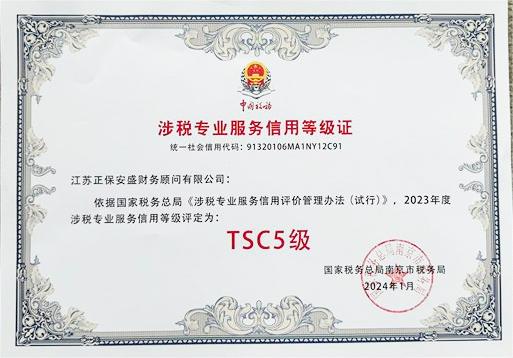 涉稅專業(yè)服務(wù)信用等級TSC5級最高認(rèn)證